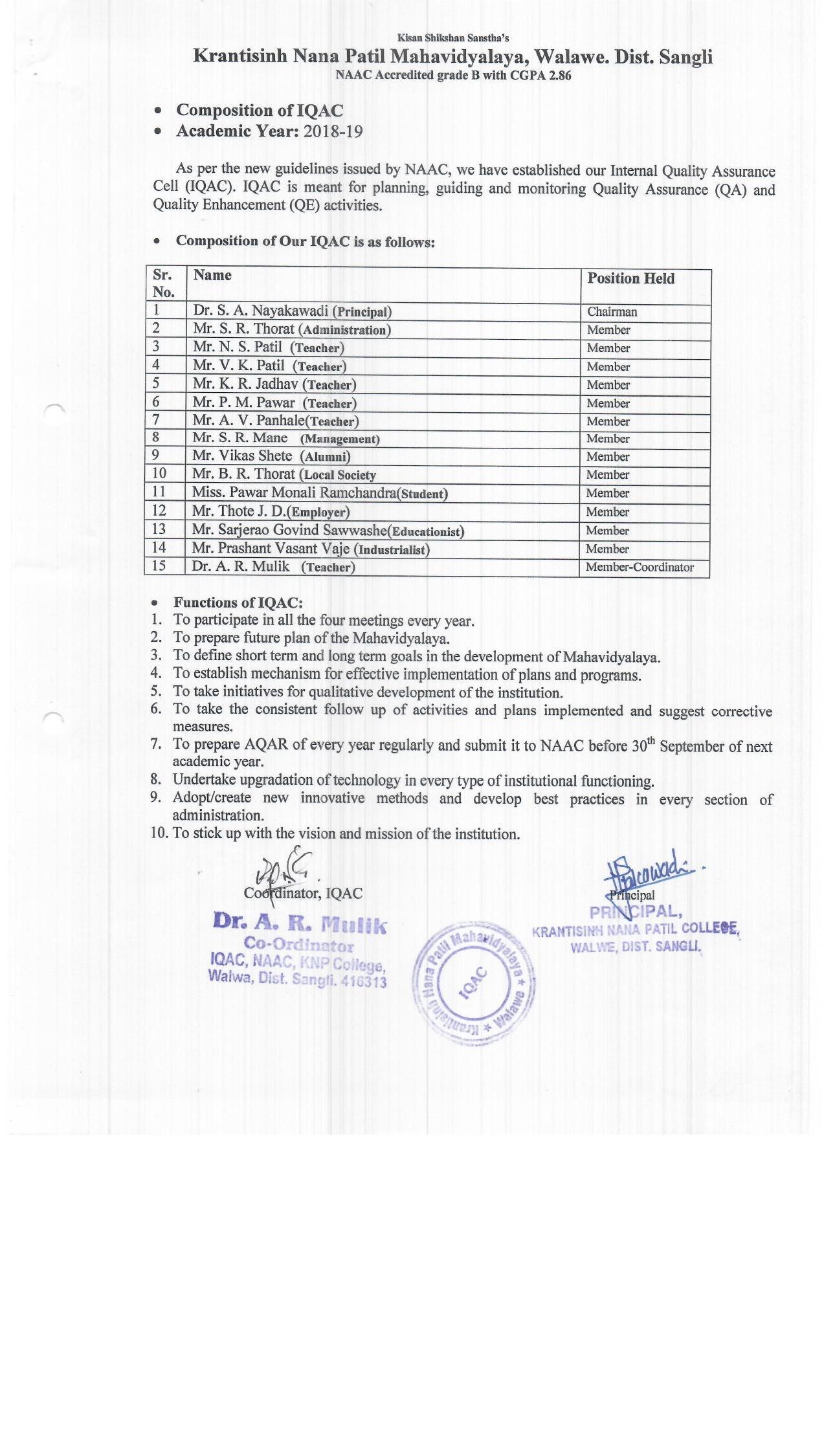 - Developments and applications of quality benchmarks/parameters for various academic and administrative activities of the institution; - Facilitating the creation of a learner-centric environment conducive to quality education and faculty maturation to adopt the required knowledge and technology for participatory teaching and learning process; - Arrangement for feedback response from students, parants and other stakeholders on quality-related institutional processes; - Dissemination of information on various quality parameters of higher education; - Organization of intra-institutional workshops, seminars on quality related themes and promotion of quality circles; - Documentation of various programs /activities leading to quality improvements;. - Acting as a nodal agency of the institution for coordinating quality-related activities including adoption and dissemination of best practices; - Development and maintenance of institutional data base through MIS for the purpose of maintaining/enhancing the institutional quality; - Development of quality culture in the institution; - Preparation of the Annual Quality Assurance Report (AQAR) as per guidelines and parameters of NAAC, to be submitted to NAAC.